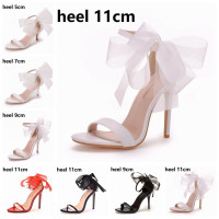 الكريستال الملكة امرأة الحلو القوس عقدة أنيقة الكاحل حزام الصنادل الطرف الأسود رقيقة عالية الكعب أحذية الزفاف الأبيض المفتوحة تو