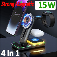 حامل شاحن لاسلكي مغناطيسي 15 وات 4 في 1 لهواتف آيفون 14 13 12 11 Pro Max Apple Watch Airpods محطة شحن سريعة شفافة