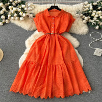 فستان صيفي نسائي فضفاض برباط صدر طويل مع حزام للخصر بياقة قميص وطوق فستان طويل مرقع D4072
